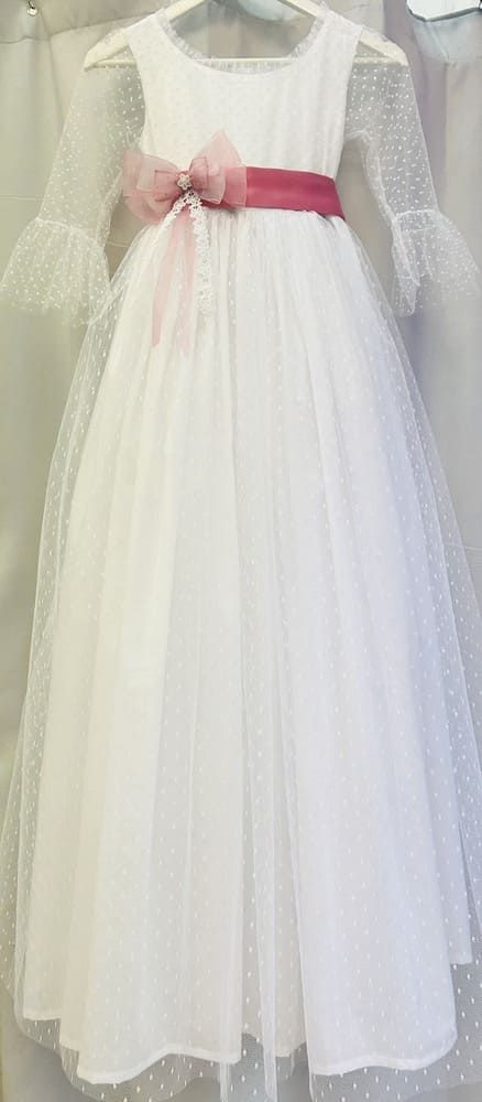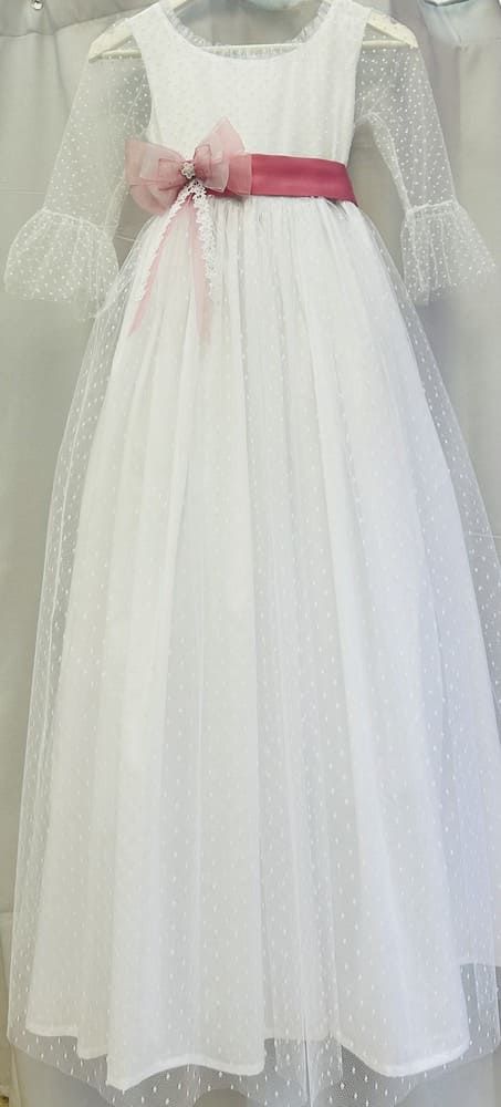 Tela plumeti en todo el vestido. Talla 12/14. Color blanco. Fajín incluido excepto el adorno del fajín (se vende por separado) 150€.